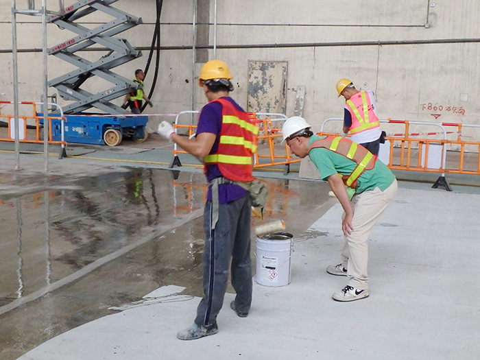 本社からもお客様へのご挨拶と施工の確認も兼ねて国際事業部の岡崎氏にも来てもらっています。香港では駐車場床をはじめとして、いわゆる塗り床の大きな市場が厳然として存在しますが、日本ではこの塗り床市場は余り積極的に展開を図られている市場ではありません。我々の意図としましては、香港市場のみならず、この塗り床の市場を日本でも再確認し、逆輸入と言う形で再上陸させたいのです。